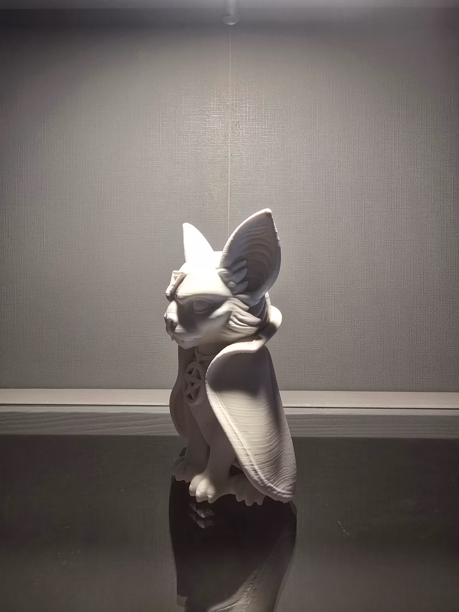 Möt vår 3D-printade Gotiska Fladdermus – en mystisk varelse med stora spetsiga öron, svepande mantel och magiska symboler. Med sin intensiva blick och ockulta aura blir den ett unikt tillskott för alla som älskar gotik, fantasy eller mörk elegans.