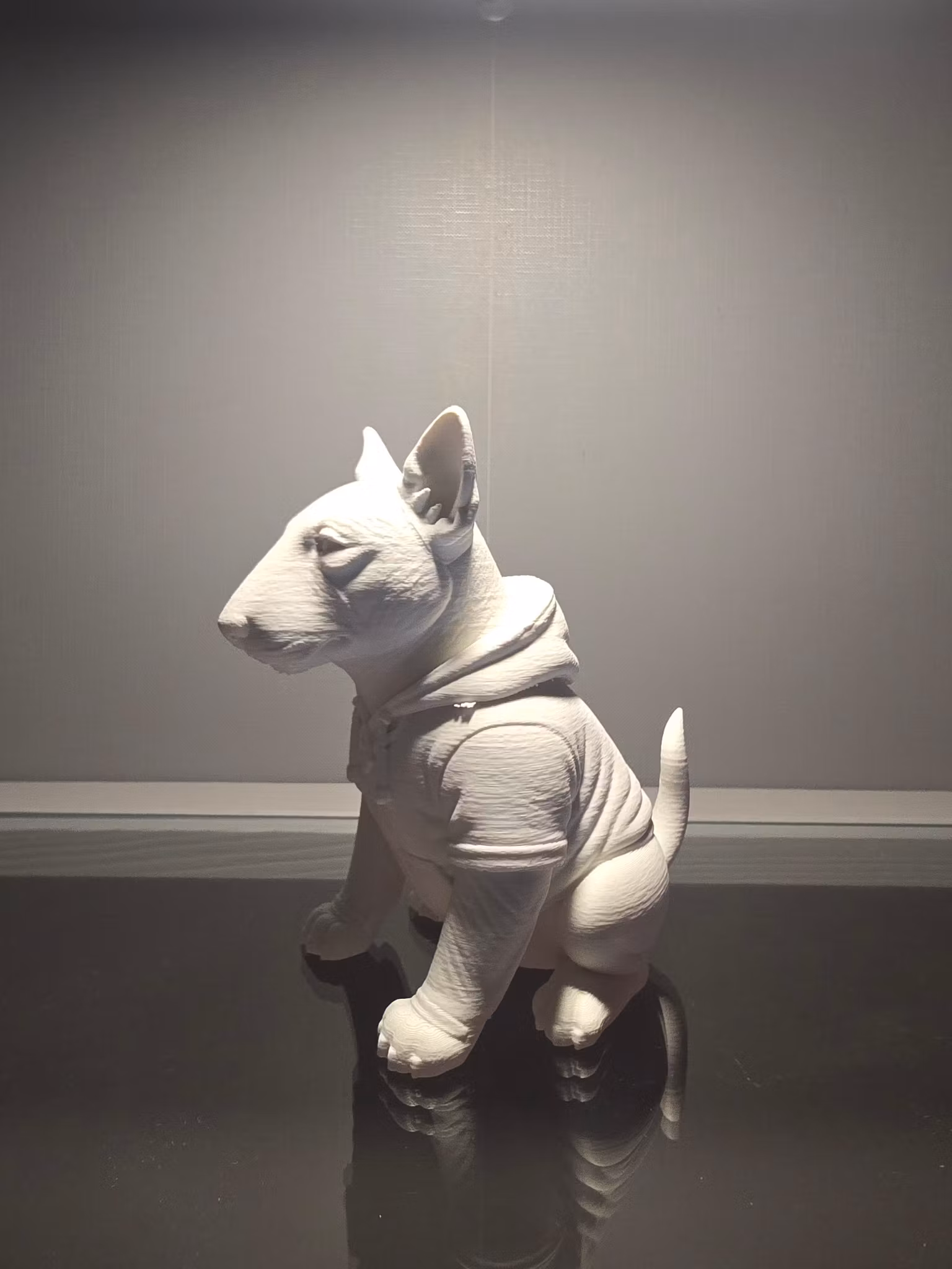Möt vår 3D-printade Hoodie-Hund – en stilren bullterrier i mjuk hoodie, redo att sprida lugn och cool energi var den än placeras. Med sin avslappnade kroppshållning och fokuserade blick är den en perfekt mix av streetstyle och sällskap.