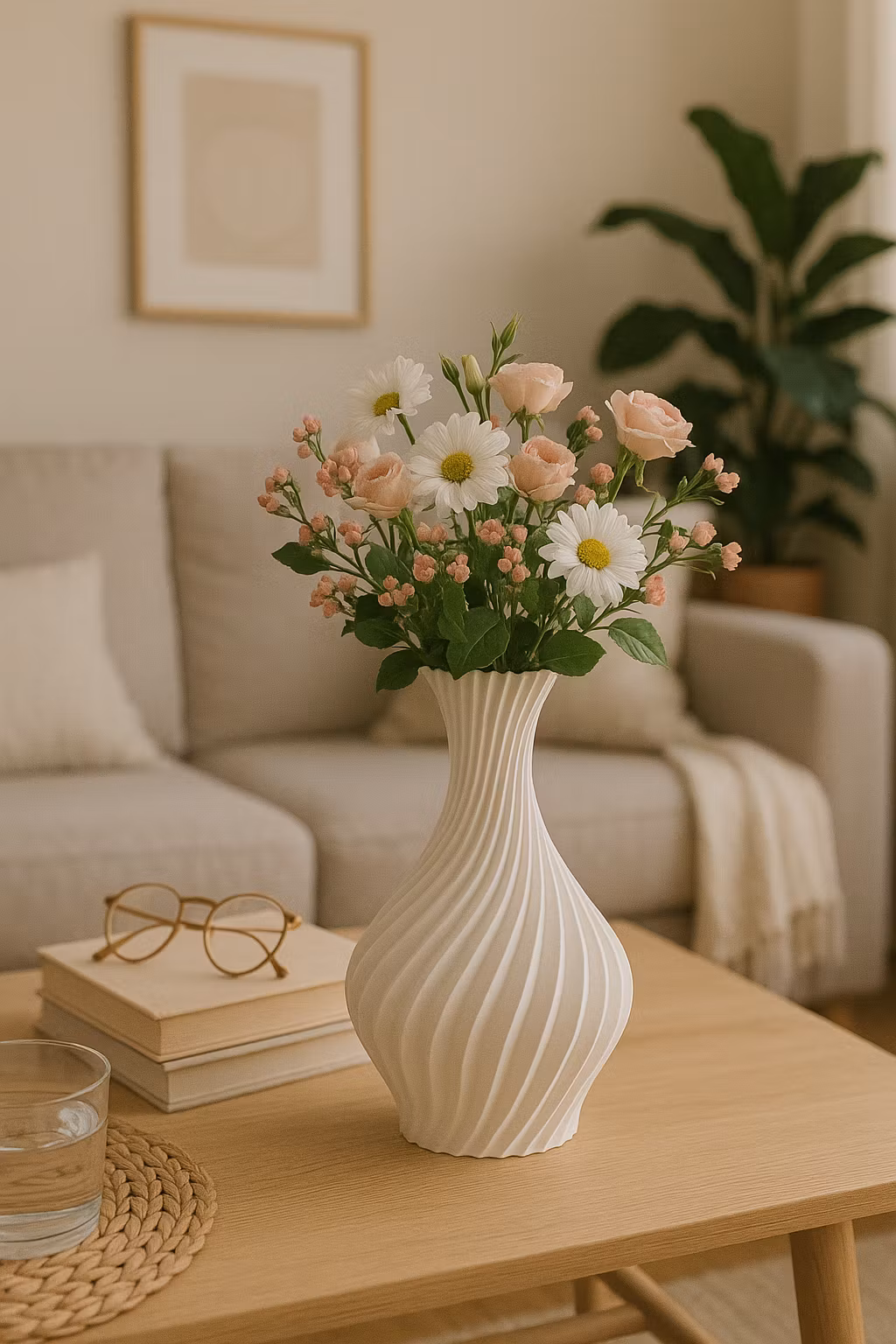 Denna stilrena 3D-printade vas kombinerar klassisk form med modern teknik. De mjukt vridna linjerna ger ett harmoniskt och lyxigt uttryck – perfekt för att lyfta blommor, kvistar eller bara stå som en vacker inredningsdetalj.
