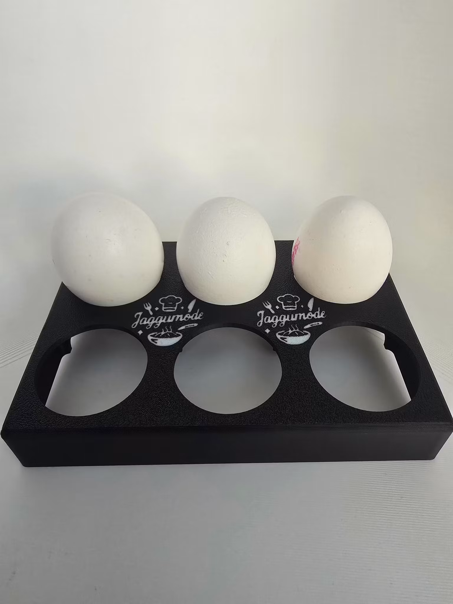 Tillverkad i hållbar PLA-plast och designad med både funktion och stil i åtanke – det här är inte bara en ägghållare, det är ett statement i köket. Den mattsvarta ytan och den vita loggan ger ett snyggt och modernt intryck, oavsett om du dukar upp till brunch eller bara vill ha ordning i kylskåpet.
